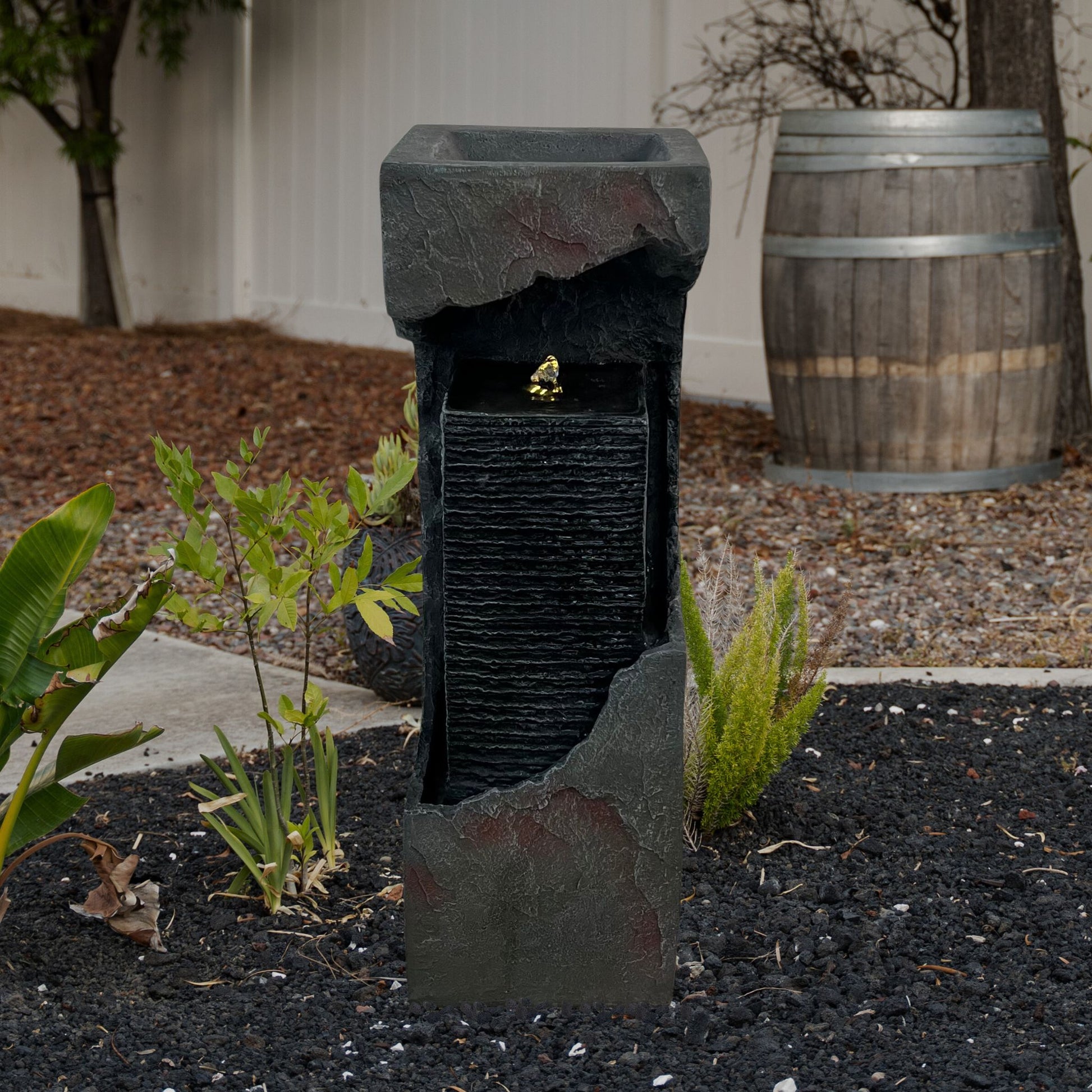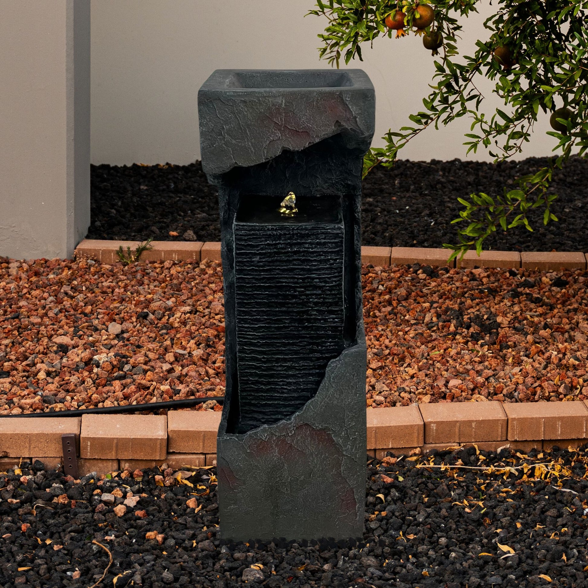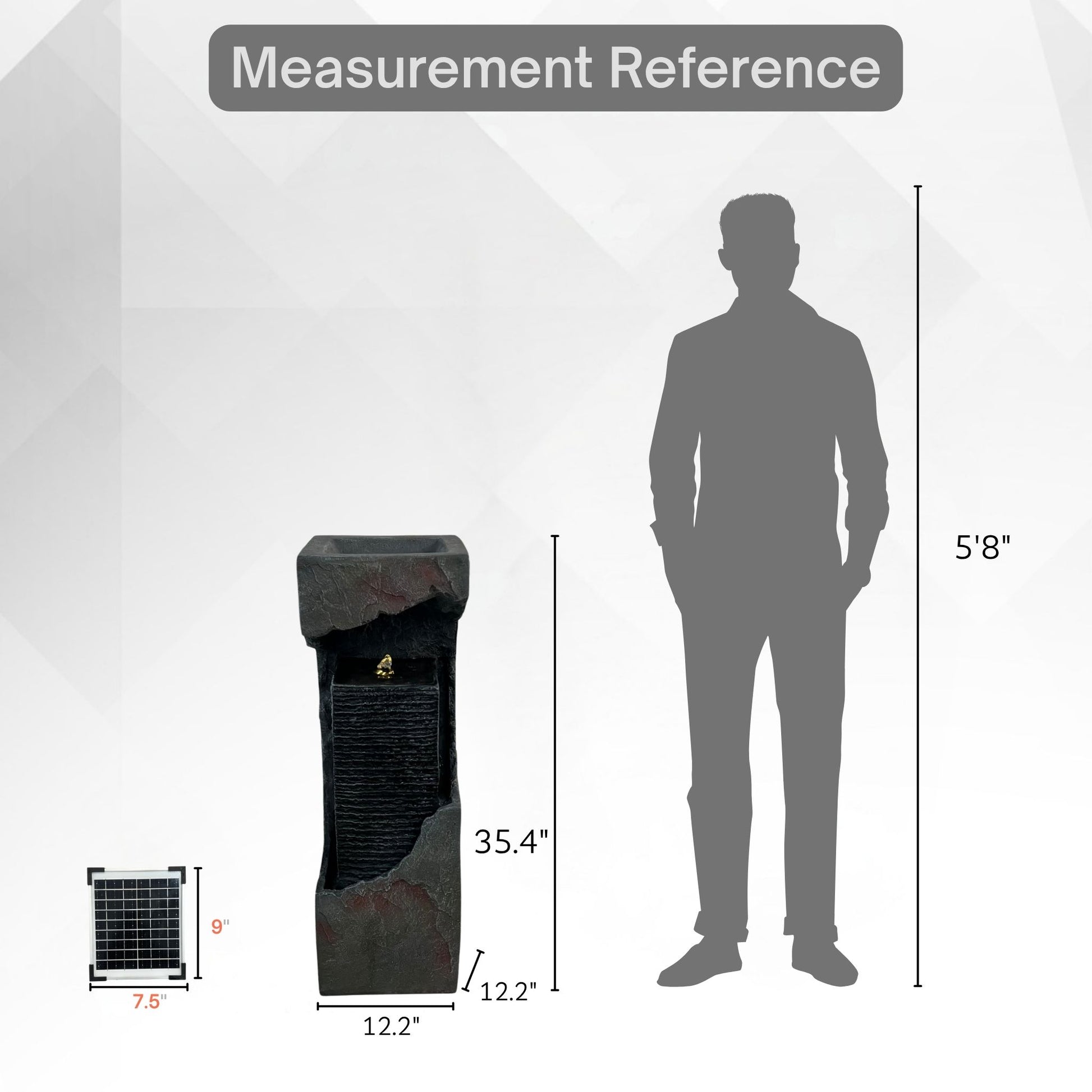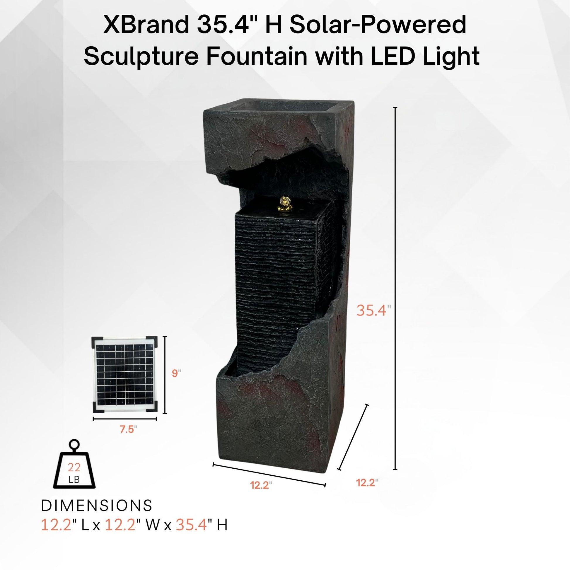 Sleek and minimalist, the 35.4-inch XBrand resin solar fountain elevates any space with its modern box-style silhouette and calming cascade. Lightweight yet durable, it suits both indoor and outdoor settings—living rooms, patios, gardens, or entryways—while the gentle water flow fosters soothing ambiance. An electric-powered pump delivers steady circulation, and the auto-shutoff feature safeguards the system at low water levels. Easy to maintain and reposition, just refill the rear reservoir with soft or distilled water for smooth, reliable performance and effortless elegance.