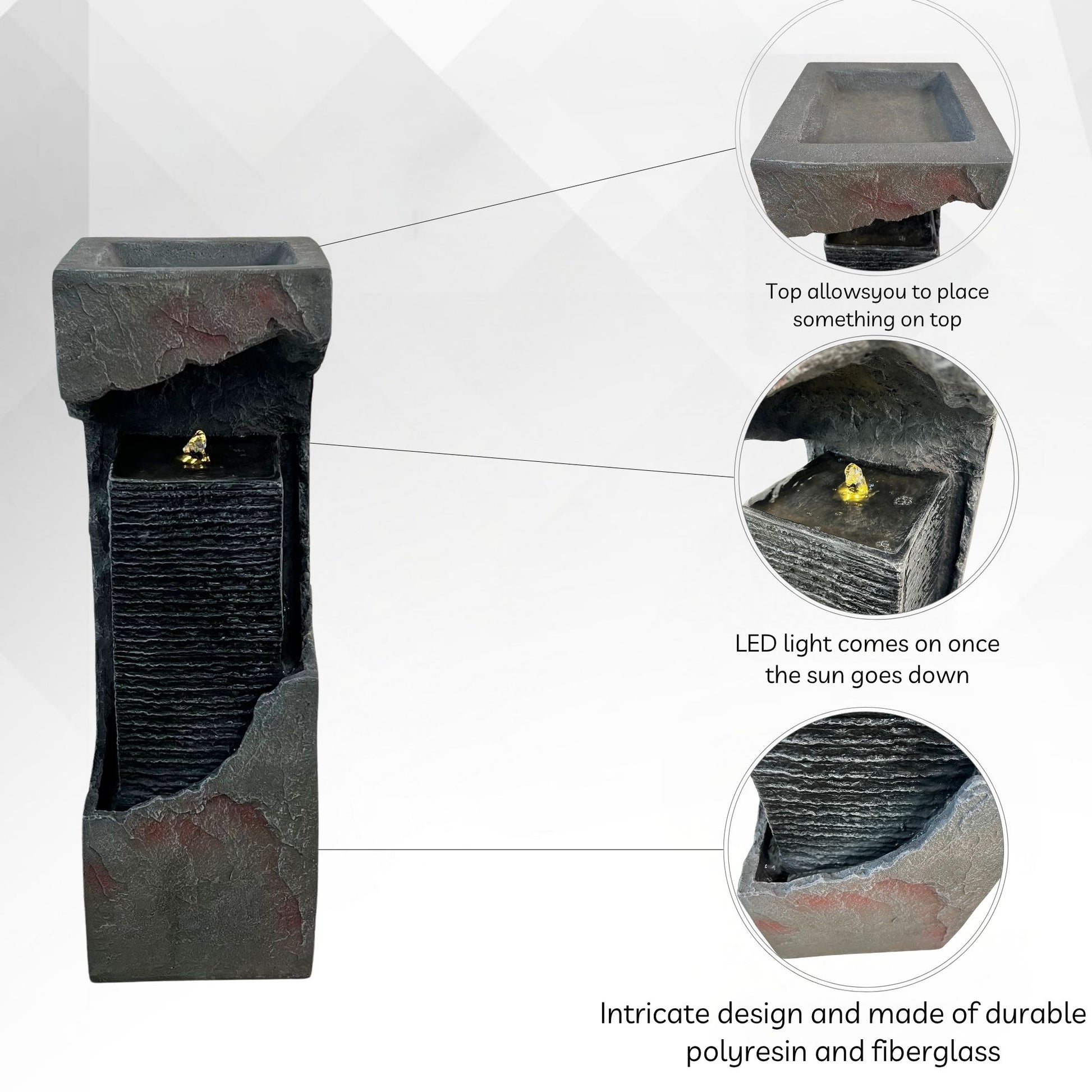Whether enhancing your garden ambiance or creating a tranquil indoor focal point, this modern fountain is a stylish and functional addition to any home or outdoor living area.