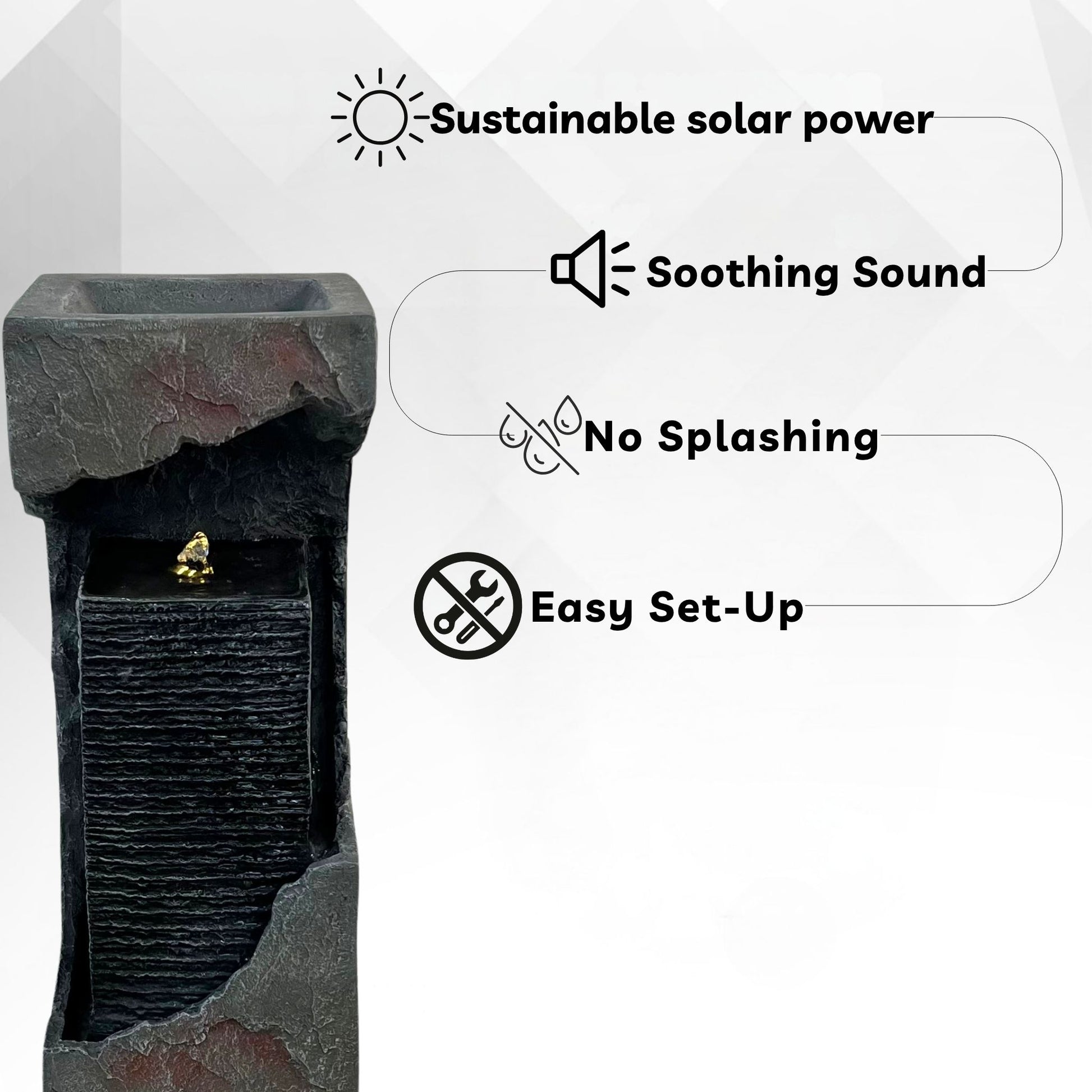 Transform your space into a calming retreat with the XBrand 35.4" Modern Resin Solar Fountain. Designed with a sleek, minimalist box-style structure, this freestanding water feature adds a touch of elegance to both indoor and outdoor decor. Made from durable resin, it offers long-lasting use while remaining lightweight and easy to reposition. The gentle water flow creates soothing sounds that promote relaxation in living rooms, patios, gardens, or entryways.
